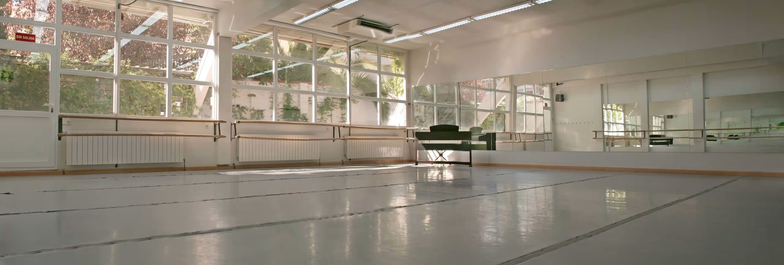 Amplias salas para la práctica de danza con renovación continua de aire y perfectamente climatizadas. Hall con espacio adecuado para los más pequeños.